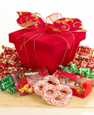 d) Small Red Velveteen Package: This soft velveteen box - with its whimsical shape and dramatic bow - is an elegant presentation for the opulent assortment of treats stored inside- Lindt chocolate truffles, chocolate peppermint pretzels, Scottish shortbread and tons of assorted toffees! (Original Price: $33 On Sale: $19.99)