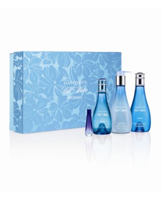 c) Davidoff Cool Water Surprisingly Cool Set for Women: Davidoff Cool Water Woman offers a special delight in SURPRISINGLY COOL. Boxed and ready for gift giving, inside she'll find full size versions of - Eau de Toilette Spray, Moisturizing Body Lotion, Gentle Shower Breeze PLUS a deluxe mini of NEW Cool Water Wave Eau de Toilette. (Original Value: $123 Now for:$59.00)
